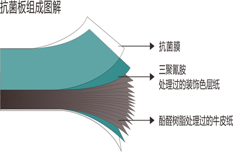 公共场所内的人们常接触到的台面、墙体、凳面等携带的细菌数量是厕所内细菌总量的125倍,而在常温下,一些细菌能在仅仅20分钟内繁殖到2倍的数量;CANNA通过不断创新在常规抗倍特板的基础上研发出表面具有抗菌性能的板材。在板材的表面增加了一层抗菌活性膜,芯材用进口牛皮纸经酚醛胶浸泡后,在高温下压制而成。CANNA抗菌板适用于直接接触人体或食物的台面板,医疗和卫生领域的室内台面墙面等。